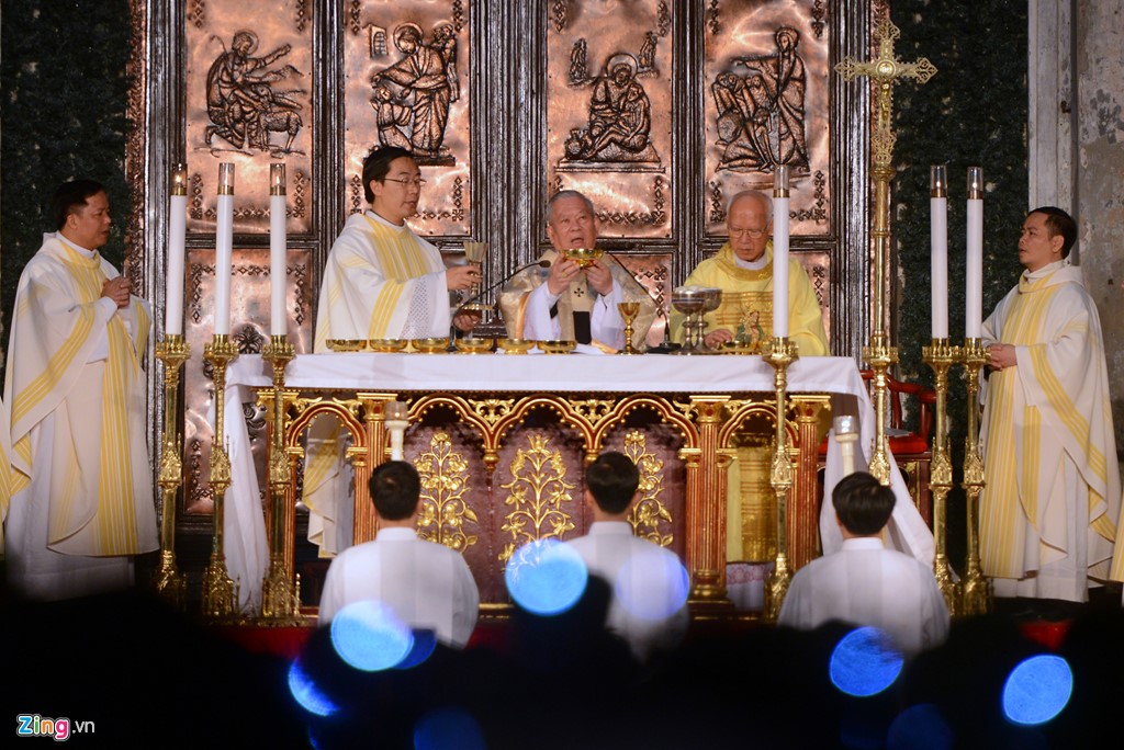 Trên sảnh chính trước cửa nhà thờ, các vị linh mục làm lễ đón Chúa Giáng sinh và cầu nguyện cho mọi người.