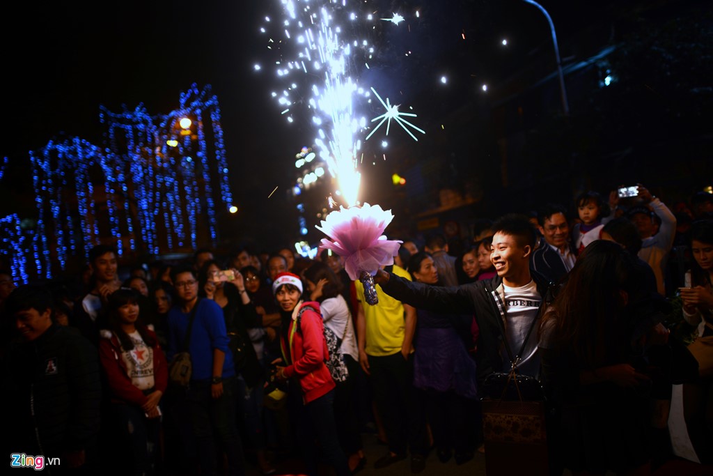 Tại thời khắc 0h, trước cửa Nhà thờ Lớn, người dân bất ngờ thấy một thanh niên rút bó hoa kèm theo cây pháo sáng.