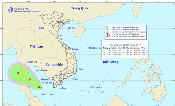 Dự báo trong 24 giờ tới, vùng áp thấp này di chuyển chậm theo hướng Tây Bắc, mỗi giờ đi được khoảng 5-10km và có khả năng mạnh lên thành áp thấp nhiệt đới. Đến 1h giờ ngày 8/11, vị trí tâm áp thấp nhiệt đới ở vào khoảng 10,2 độ Vĩ Bắc; 100,2 độ Kinh Đông, trên khu vực phía Tây Vịnh Thái Lan. Sức gió mạnh nhất ở vùng gần tâm áp thấp nhiệt đới mạnh cấp 6 (40 đến 50 km/giờ), giật cấp 8.