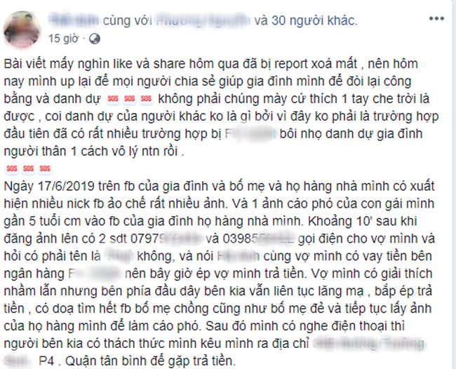 Theo anh T.A, ngày 17/6/2019, tài khoản facebook của T.A, họ hàng và người thân của anh xuất hiện nhiều nick ảo chế ảnh lăng mạ, bôi nhọ danh dự của gia đình. Đáng chú ý là việc các nick ảo này dùng hình ảnh con gái mới 5 tuổi của T.A ghép vào ảnh cáo phó, bên dưới bức ảnh còn có những lời lẽ rất mất nhân tính: “lý do chết vì mẹ mượn nợ không trả nên con bị quả báo”.