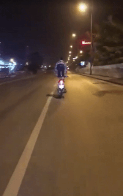 Theo hình ảnh trong đoạn clip, sự việc xảy ra buổi tối, trên đoạn đường vắng, ít người qua lại. Một nam thanh niên chạy xe máy bất ngờ buông hai tay, sau đó thu chân, đứng thẳng trên xe máy và bắt đầu giơ tay lên cao như biểu diễn xiếc.