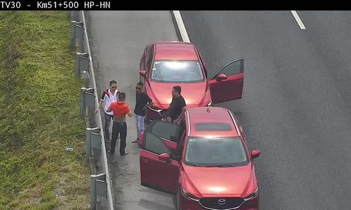 Vào khoảng 9h45 sáng 14/5, hai chiếc Mazda đỏ mang BKS 15A-53917 và 15A-54661 đã đỗ xe sai quy định tại Km51+500 trên địa bàn ở Lê Chân, Hải Phòng, di chuyển theo hướng Hải Phòng - Hà Nội. Hình ảnh ghi lại cho thấy, sau khi dừng xe, khoảng 5 người trên 2 xe đã xuống đường, đứng hút thuốc và nói chuyện.
