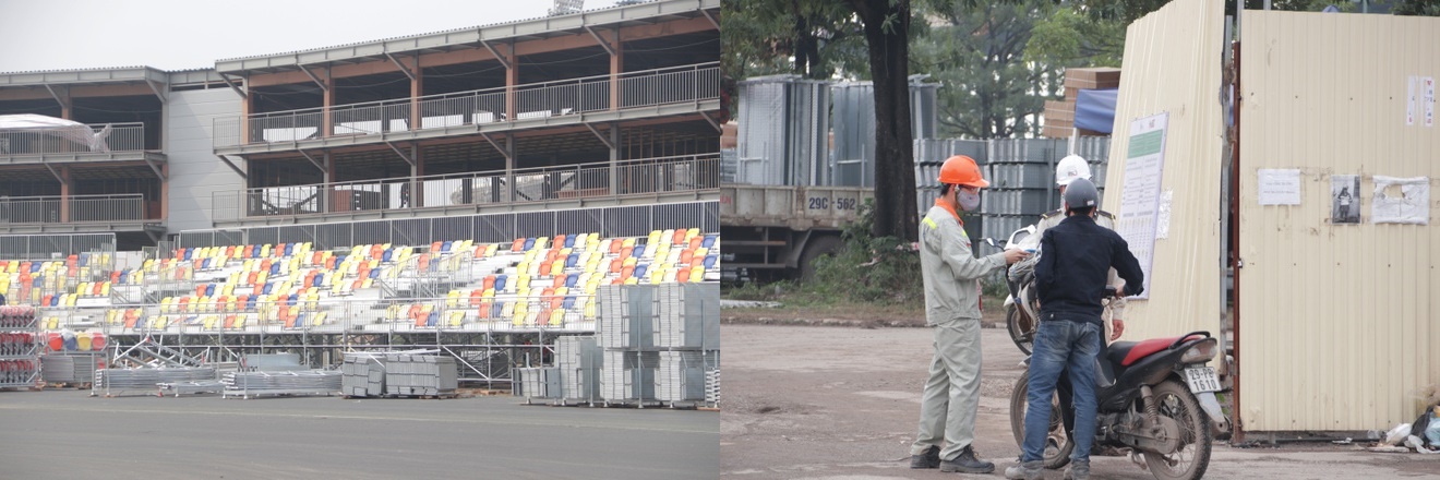 Nhà điều hành, hệ thống nhà dịch vụ, khán đài đang gấp rút được hoàn thiện. Công nhân đang lắp ghép những ghế ngồi tại khán đài.