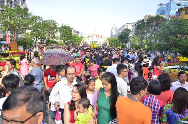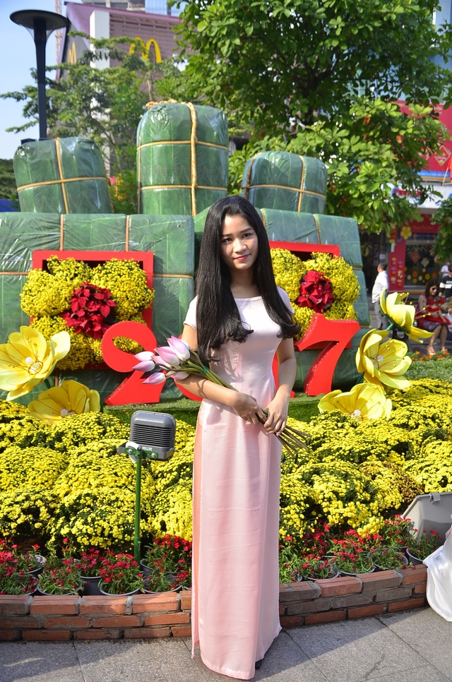 Từng đoàn khách gia đình, nam giới ăn mặc lịch sự, phụ nữ tha thướt trong tà áo dài truyền thống, trẻ em tung tăng trong bộ áo mới… thong thả ngắm đường hoa.
