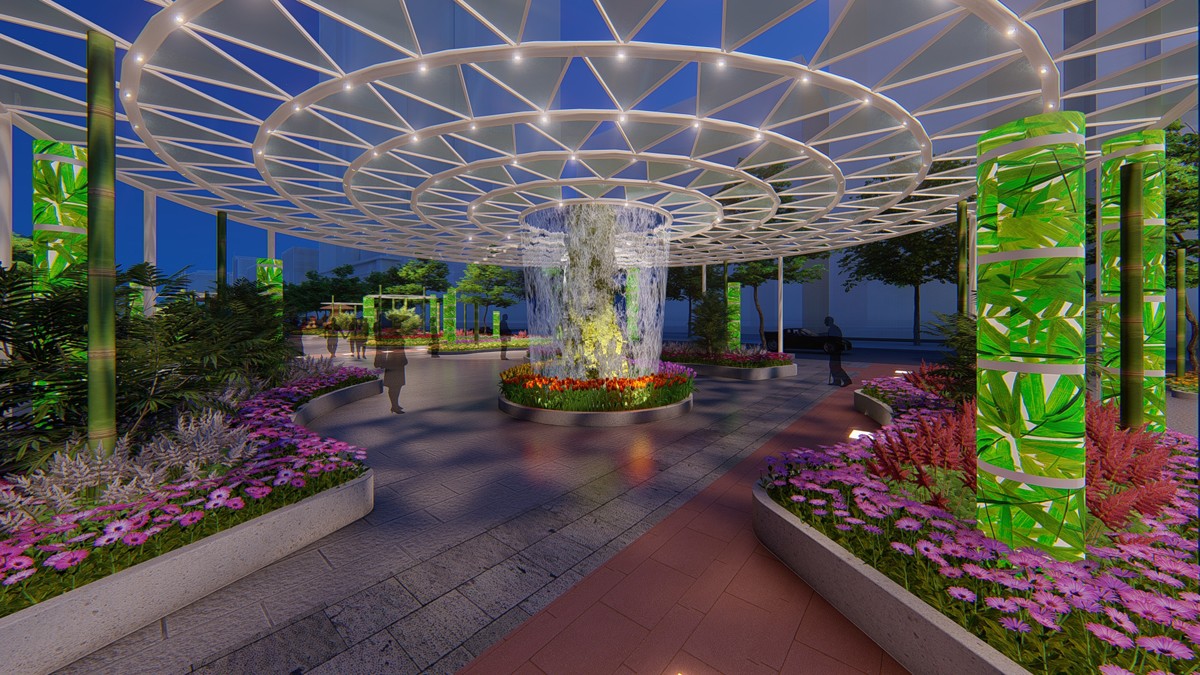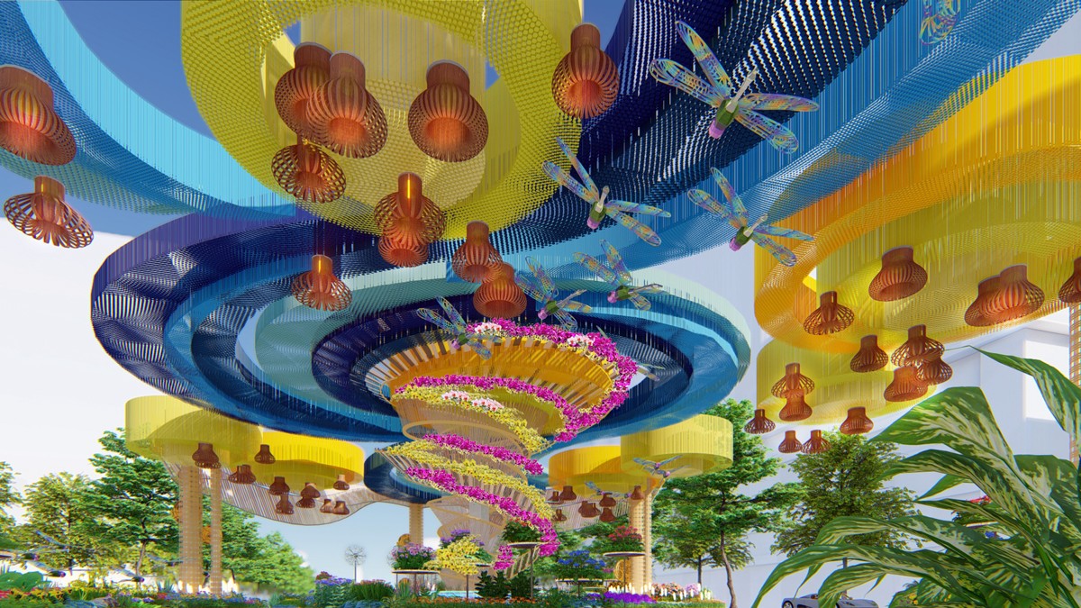 Tạo hình mái được thiết kế thành dải xoáy - biểu trưng cho sự đa dạng của môi trường, kết hợp với các dải hoa dưới mặt đất và khối hình đài nước - thể hiện sự giao thoa giữa thiên nhiên đất trời.