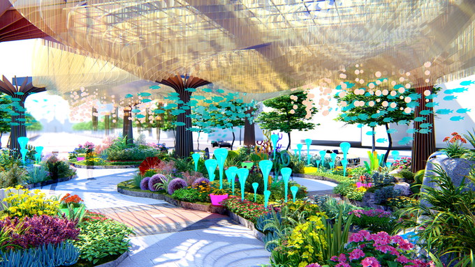 Các cụm linh vật ở đường hoa được thiết kế toát lên sự vui vẻ, thể hiện tinh thần lạc quan và yêu đời. Tất cả đều mặc áo dài họa tiết, đội nón lá, khăn rằn, mũ lưỡi trai hoặc đeo băng đô.