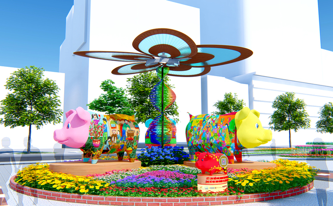 Theo Ban tổ chức, đường hoa năm nay đặc biệt vì có 6 chú heo đất nghĩa tình tại 6 vị trí. Bắt đầu từ hai đảo nhỏ cổng đường hoa, người dân sẽ thấy sự xuất hiện của chú heo đỏ trên lưng mang họa tiết mai vàng và biểu tượng đồng tiền với tên gọi Nuôi heo đất Tết làm điều hay, chung tay đóng góp cho học sinh nghèo TP HCM.