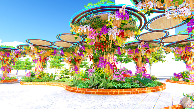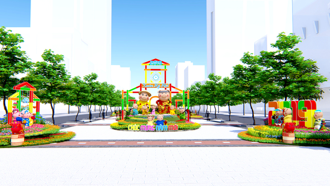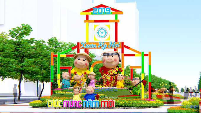 Cổng đường hoa ở vị trí trung tâm là đại gia đình Hợi với 9 thành viên cùng nhau đi chơi, sắm Tết ở chợ Bến Thành - chợ truyền thống nổi tiếng Sài Gòn, nơi thu hút rất đông người dân, du khách đến tham quan và mua sắm. Chiều cao cổng chính là hơn 6,8 m. Trong đó, heo cha cao 2,9 m và heo mẹ cao 2,6 m trong trang phục áo dài nón lá; áo dài khăn rằn đặc trưng Nam Bộ với hai gam màu: đỏ của sự may mắn, vàng của sự thịnh vượng.