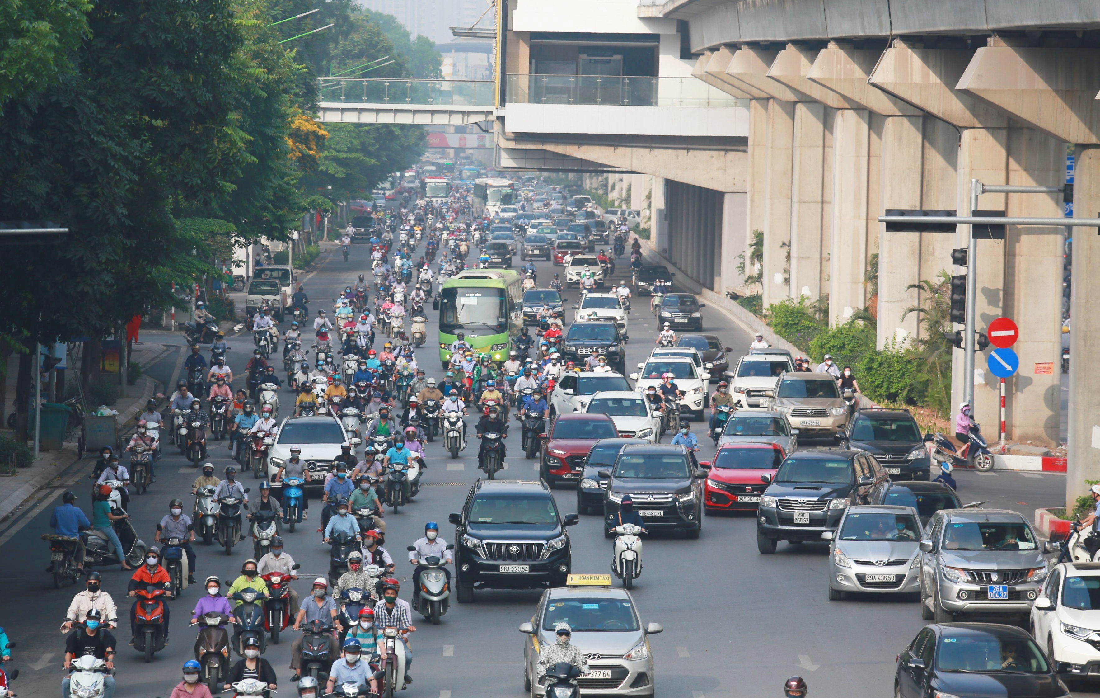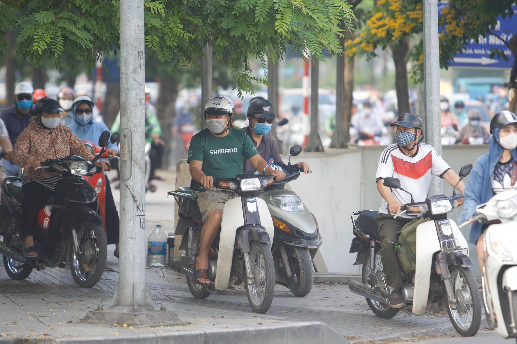 Hình ảnh dòng người di chuyển lúc 7h sáng trên đường Nguyễn Trãi.
