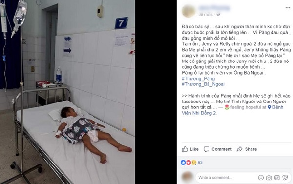 Trước đó, chia sẻ với Zing.vn, chị cũng tiết lộ bé Pàng bị trĩ, sốt và viêm họng cấp. Đến chiều 12/1, bệnh tình có chuyển biến khiến Pàng đau đớn, gia đình phải đứa em vào viện điều trị. Hiện, bé Pàng được ông bà ngoại chăm sóc tại bệnh viện.