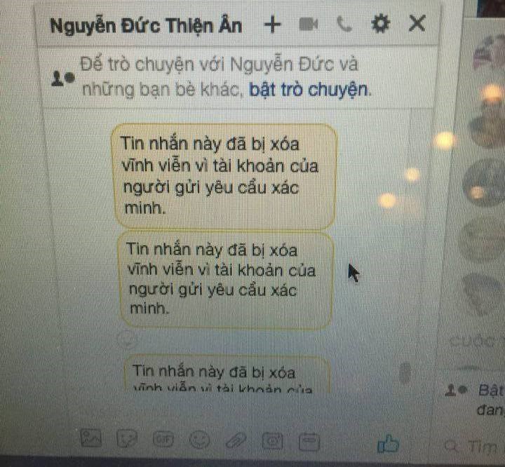 Các tin nhắn mà anh gửi cho người khác đều biến mất, mà thay bằng dòng hiển thị “Tin nhắn này đã bị xóa vĩnh viễn vì tài khoản của người gửi yêu cầu xác minh”.