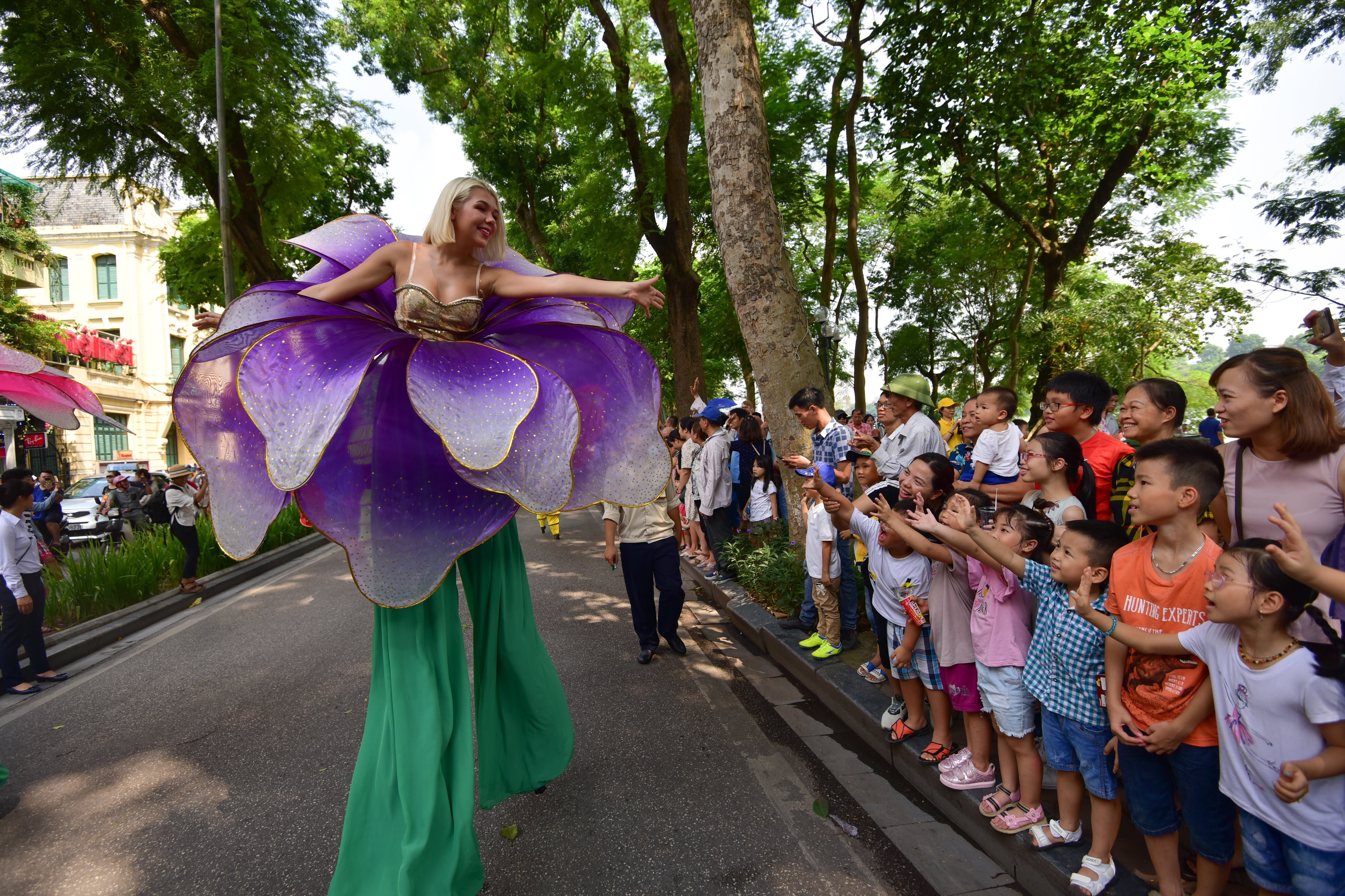 Người dân và du khách đến với phố đi bộ hồ Gươm hào hứng được tận mắt chiêm ngưỡng các nghệ sĩ quốc tế trong các trang phục hết sức cầu kỳ và ấn tượng trình diễn các tiết mục nghệ thuật độc đáo.