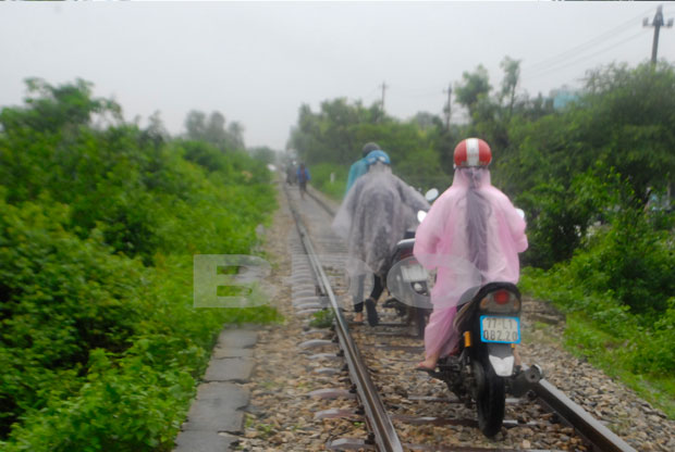 Nhiều người dân bất chấp nguy hiểm điều khiển xe máy trên đường sắt để qua các đoạn đường bị ngập sâu.
