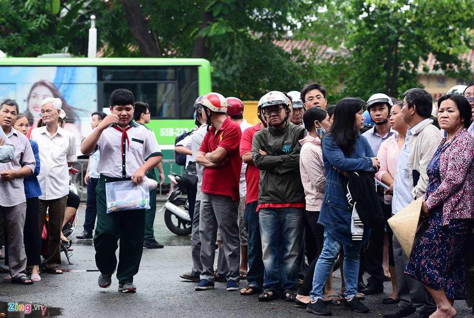 Tại điểm thi THCS Trương Công Định, 768 thí sinh của 6 trường dự thi. Phụ huynh phải đưa con đi thi từ sáng sớm đề phòng trường hợp kẹt xe. Nhiều người vẫn chờ trước cổng trường, ngóng theo con vào phòng thi.