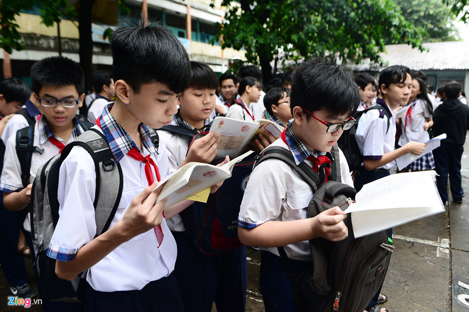 Tranh thủ thời gian trước khi vào phòng thi, nhiều em xem lại các tác phẩm đã học. Theo lãnh đạo Sở GD&ĐT TP.HCM, đề thi lớp 10 năm nay tiếp tục được ra theo hướng mở, tăng cường câu hỏi từ thực tiễn cuộc sống.