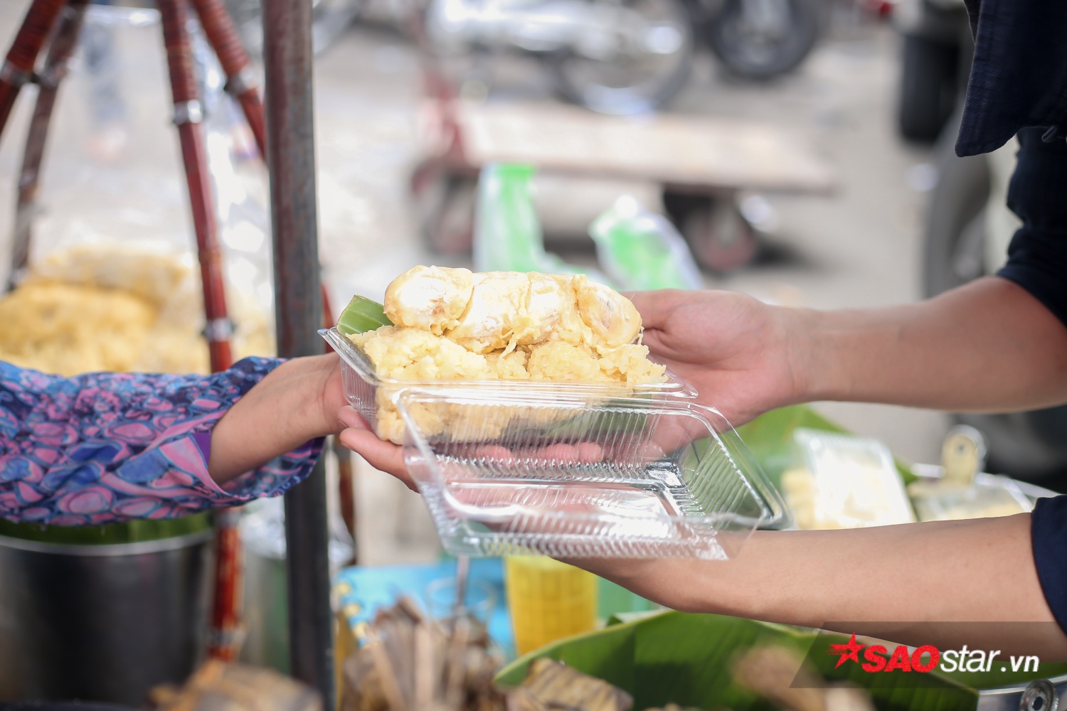 Hạt xôi to mềm được vò kỹ cùng lớp đậu xanh, sau đó sẽ bọc thêm một ít sầu riêng tán nhuyễn để tạo độ béo cho món ăn. Đặc biệt, giữ cho màu xôi luôn vàng ươm, dì Hà còn gói trong nếp lá chuối xanh. Ấy thế, xôi vừa đẹp con mắt, vừa no cái bụng, nên ai nấy đều thích thú.