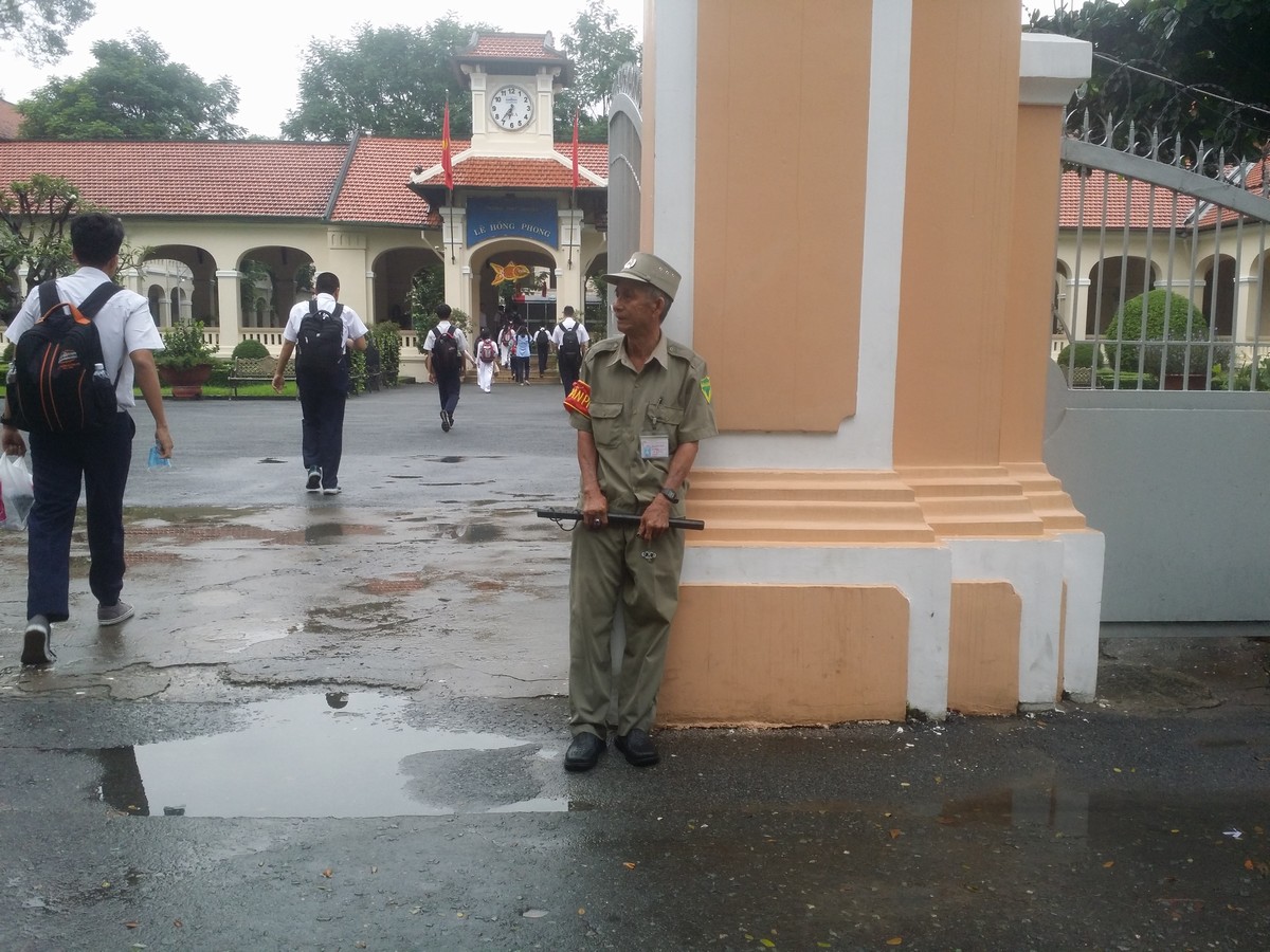 Tìm đến ngôi trường Lê Hồng Phong, chúng tôi gặp ngay bác bảo vệ ở cổng. Bác Lũy năm nay đã 71 tuổi, tóc bạc, da cũng nhăn nheo nhưng lại chỉ mới làm việc ở trường Lê Hồng Phong cách đây khoảng 3 năm. Công việc của bác khá đơn giản, mỗi ngày chỉ cần đứng ở cổng trường để giữ gìn trật tự. Vậy mà, bất cứ học sinh nào, mỗi khi bước chân qua cánh cổng sắt nơi bác đứng, đều lễ phép cúi chào, miệng nở những nụ cười thật xinh.