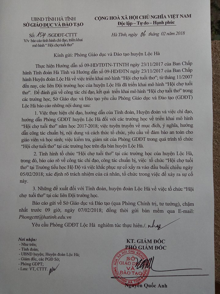 Bên cạnh đó, Sở cũng yêu cầu Phòng GD&ĐT huyện Lộc Hà rà soát lại toàn bộ công tác tổ chức hội chợ tuổi thơ tại tất cả các trường học trên địa bàn huyện Lộc Hà.