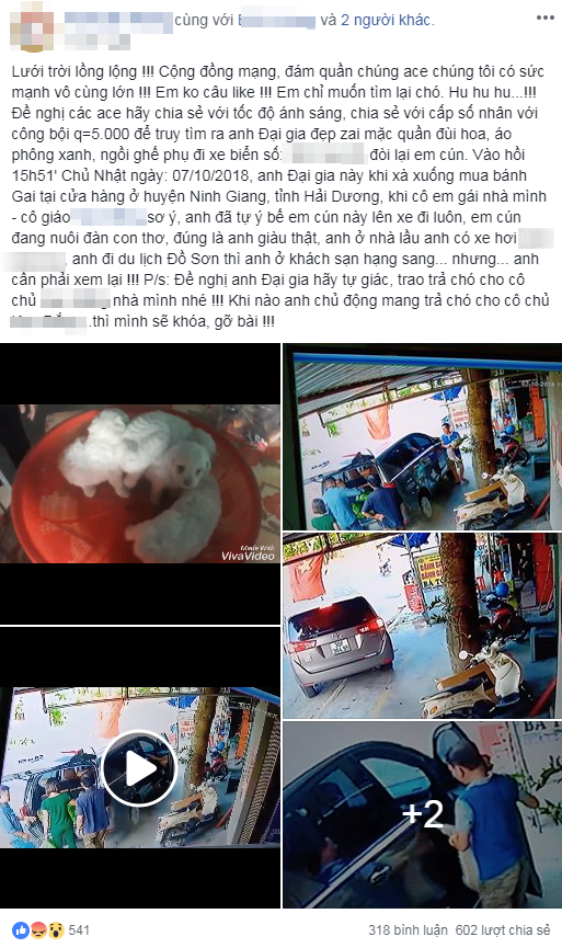 Theo chủ nhân bài viết, sự việc xảy ra vào 15h50 ngày 7/10 vừa qua. “Anh trai mặc quần đùi hoa, áo phông xanh xuống xe mua bánh gai tại cửa hàng ở huyện Ninh Giang, tỉnh Hải Dương. Khi em gái mình sơ ý đã tự ý bế chú chó lên xe”, tài khoản V.X.H viết.