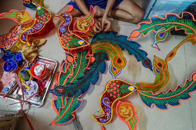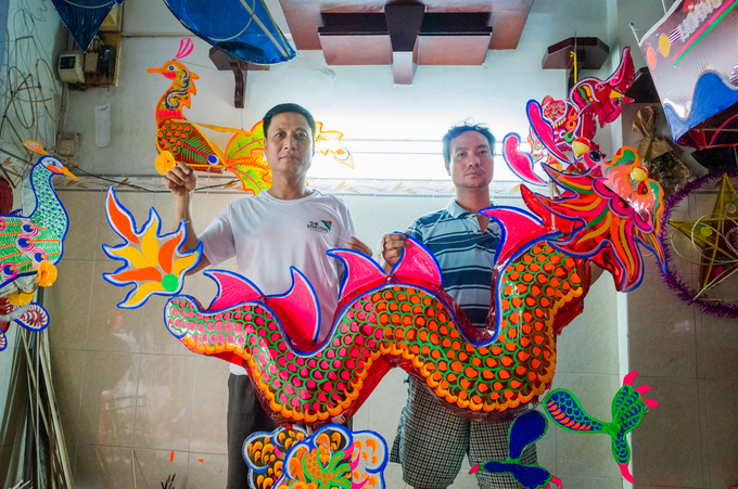 Nằm sâu trong xóm đạo Phú Bình (quận 11, TP HCM), gia đình ông Nguyễn Trọng Thành được biết đến là hộ làm lồng đèn giấy kiếng độc đáo nhất xóm. Mỗi mùa Trung thu, gia đình sản xuất hàng nghìn chiếc đèn cỡ lớn. “Nhà tôi đã hai đời làm lồng đèn giấy kiếng. Bố mẹ từ Nam Định vào Sài Gòn làm, rồi tới anh em tôi. Ban đầu, cả 8 anh em cùng làm, giờ nghề khó khăn chỉ còn hai anh em”, ông Thành (50 tuổi, trái) cùng ông Nguyễn Trọng Bình (40 tuổi) bên con rồng dài 1,5 m mới hoàn thành.