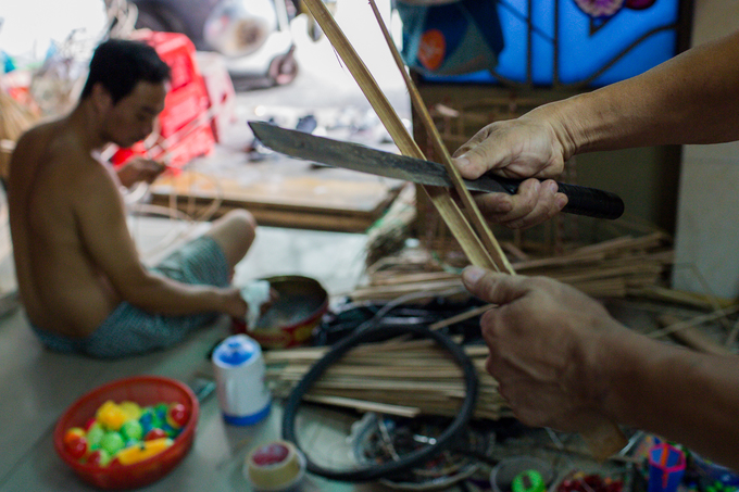 Theo ông Thành, để làm chiếc đèn lồng khổng lồ phải tốn rất nhiều thời gian chuẩn bị và các công đoạn gia công khác nhau. “Thời gian hoàn thiện sản phẩm thường trước Trung thu một tháng nhưng trước đó, từ đầu năm anh em tôi đã mua tre, giấy kiếng chuẩn bị”, ông Thành nói, vừa thoăn thoắt chẻ tre, một trong những công đoạn đầu tiên làm lồng đèn.