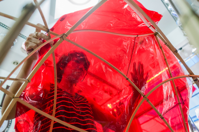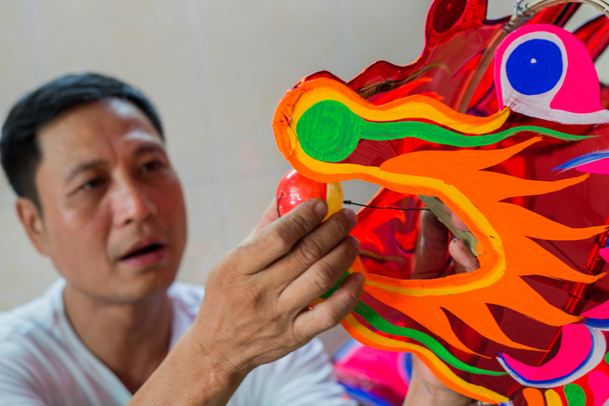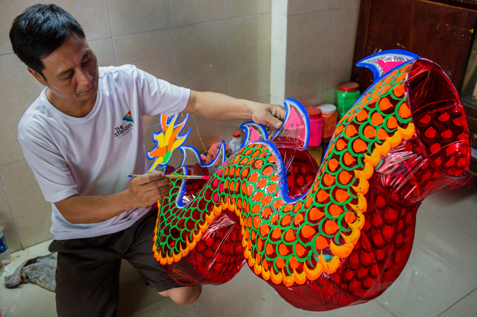 Ông Thành gắn quả bóng nhựa, tượng trưng cho hình ảnh rồng phun châu nhả ngọc, cũng là công đoạn cuối cùng hoàn thành sản phẩm.