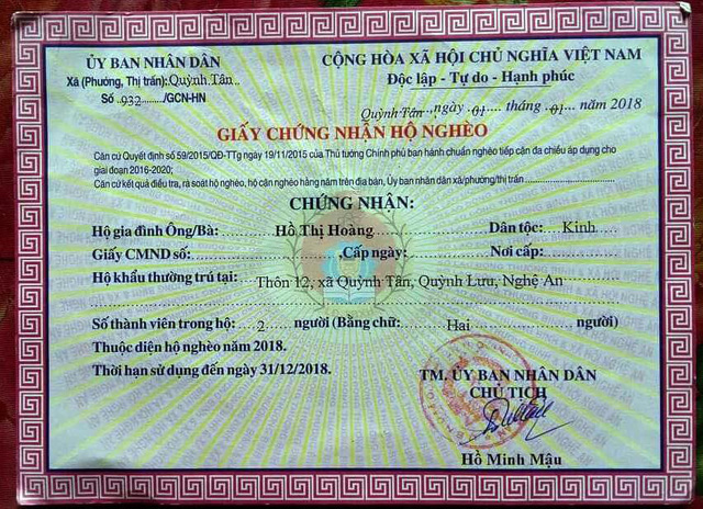 Chính quyền địa phương xác nhận, gia đình chị Hoàng là hộ nghèo liên tục trong nhiều năm qua.