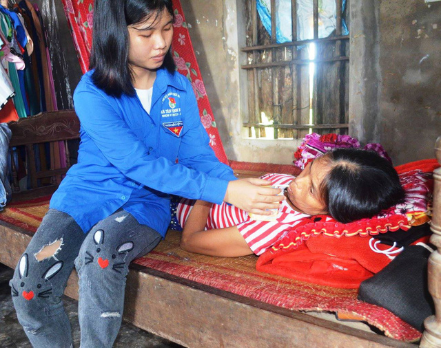 Trong câu chuyện với chúng tôi, người phụ nữ gầy gò, ốm yếu không giấu được vẻ mệt mỏi chất chồng. Chị là Hồ Thị Hoàng - mẹ em Nguyệt - sinh năm 1968, là con thứ 4 trong gia đình có tới 9 người con. Vốn là một người hiền lành, chất phác, tuổi mười tám đôi mươi chị đem lòng yêu một người đàn ông cùng xã. Hai người nên duyên vợ chồng nhưng hạnh phúc chẳng tày gang thì hôn nhân đổ vỡ. Chị Hoàng trở về tá túc trong căn nhà tạm bợ, cũ nát của người em trai. Ngày ngày chị cặm cụi bươi đất nhặt cỏ, cuốc mướn làm thuê kiếm chút tiền đắp đổi cân gạo, mớ rau sống lay lắt qua ngày.