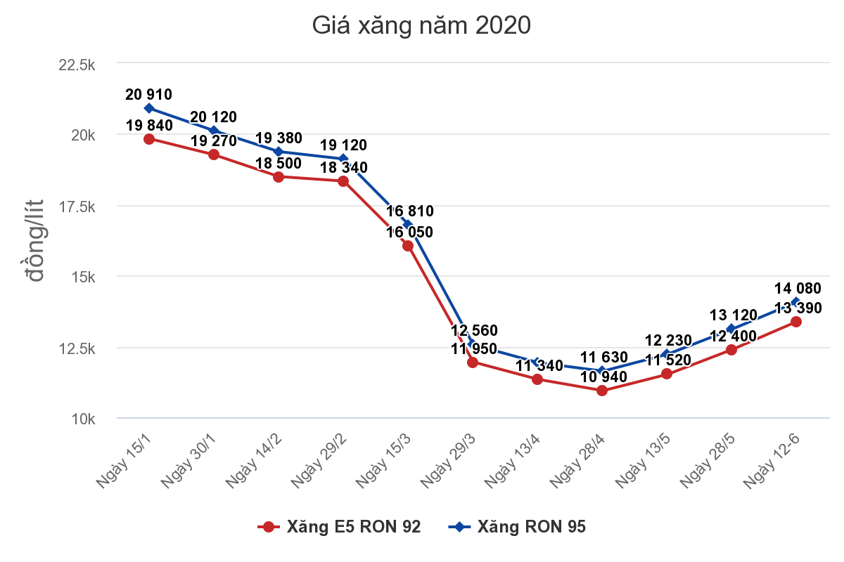 Theo đó, giá xăng RON 95 được điều chỉnh tăng 955 đồng/lít, xăng E5 RON 92 tăng 988 đồng/lít. Mức giá bán lẻ tối đa với xăng E5 RON 92 là 13.390 đồng/lít và xăng RON 95 là 14.080 đồng/lít.