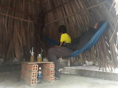 Trong chòi chỉ có 1 chiếc võng cho tiếp viên và khách. Tiếp viên trong ảnh là bé gái 13 tuổi vừa được giải cứu
