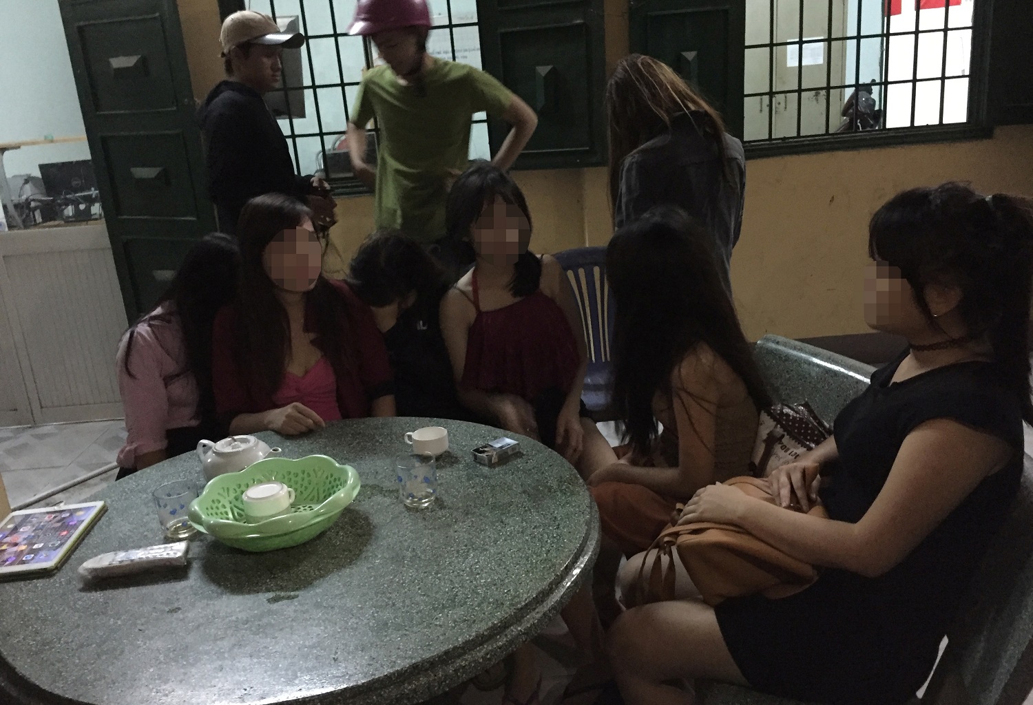 Các cô gái được mời về trụ sở công an, chờ người nhà đến đưa về gia đình.
