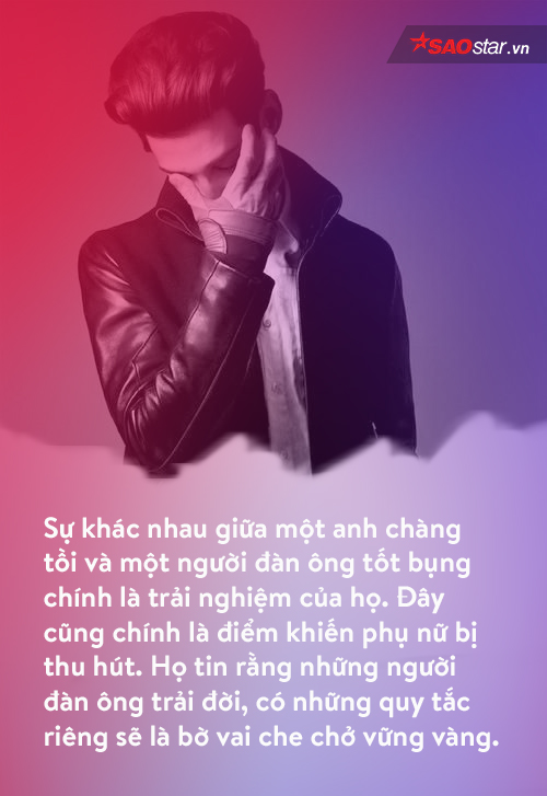 Sự khác nhau giữa một anh chàng tồi và một người đàn ông tốt bụng chính là trải nghiệm của họ. Chàng trai tồi đã phải trải qua những giai đoạn khó khăn trong cuộc đời của mình, bị xét đoán, bị từ chối nhiều lần. Bản thân họ biết rằng anh ta có thể không thể đáp ứng được những tiêu chuẩn trở thành một “người tốt” trong xã hội. Tuy nhiên, thứ mà những người phụ nữ tìm kiếm lại là một chỗ dựa an toàn và họ tin rằng những người đàn ông trải đời, có những quy tắc riêng sẽ là bờ vai che chở vững vàng.