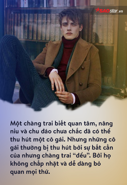 Nếu bạn là một chàng trai tốt, bạn tôn trọng và nâng niu phụ nữ, chưa chắc họ đã cảm thấy hấp dẫn với bạn. Tuy nhiên là một chàng trai tồi - họ luôn thể hiện thái độ bất cần trong mọi vấn đề và ở điểm này họ chinh phục hầu như mọi cô gái. Những chàng trai tồi sẽ không chấp nhặt và thường lựa chọn thứ tha hoặc bỏ qua.