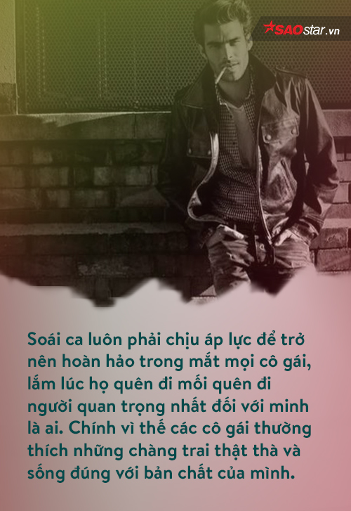 Một chàng trai được gọi là “soái ca” luôn phải chịu áp lực để cố gắng hoàn hảo trong mắt mọi cô gái. Họ cố gắng làm hài lòng tất cả mọi người mà nhiều lúc quên đi người quan trọng nhất đối với mình. Đó là lý do không phải chàng trai tốt nào cũng được phụ nữ “mê”. Phụ nữ thường thích những chàng trai thật thà và sống đúng với bản chất của mình.