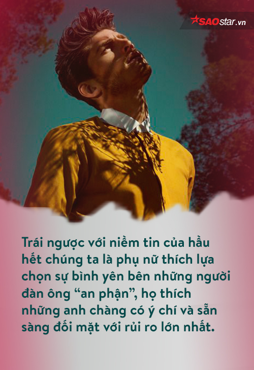 Phụ nữ rất dễ bị hấp dẫn bởi những anh chàng mạnh mẽ và thích thử thách bản thân. Trái ngược với niềm tin của hầu hết chúng ta là phụ nữ thích lựa chọn sự bình yên bên những người đàn ông “an phận”, họ thích những anh chàng có ý chí và sẵn sàng đối mặt với rủi ro lớn nhất.