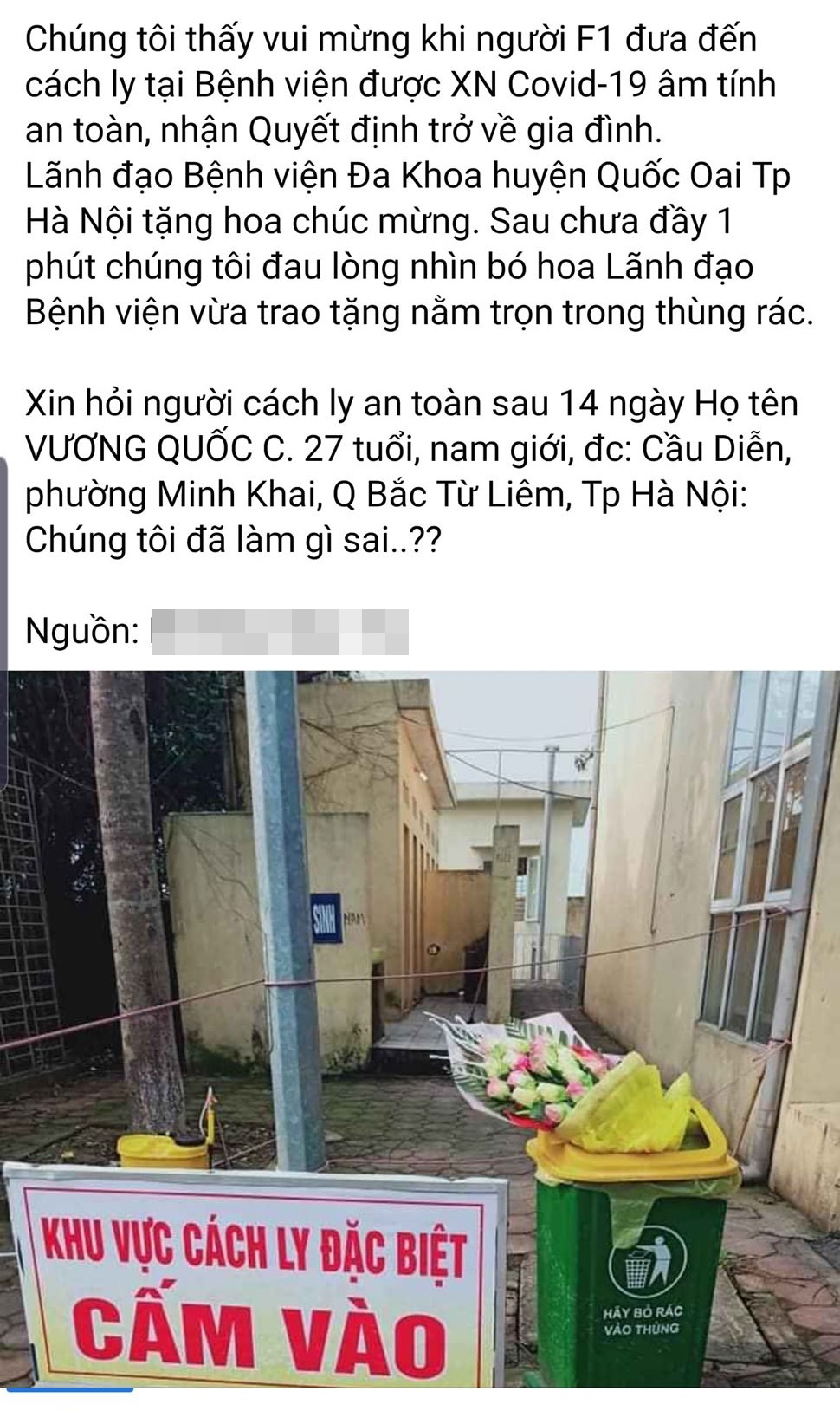 Theo đó, nội dung được đăng tải như sau: “Chúng tôi thấy vui mừng khi người F1 đưa đến cách ly tại bệnh viện được xét nghiệm COVID-19 âm tính an toàn, nhận Quyết định trở về nhà. Lãnh đạo Bệnh viện đa khoa huyện Quốc Oai tặng hoa chúc mừng. Sau chưa đầy 1 phút chúng tôi đau lòng nhìn bó hoa lãnh đạo bệnh viện vừa trao tặng nằm trọn trong thùng rác. Xin hỏi người cách ly an toàn sau 14 ngày họ tên Vương Quốc C. (27 tuổi, ở Cầu Diễn, phường Minh Khai, quận Bắc Từ Liêm, Hà Nội) chúng tôi đã làm gì sai??”