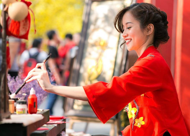 Dịp Tết này, cô nàng còn được học viết thư pháp.