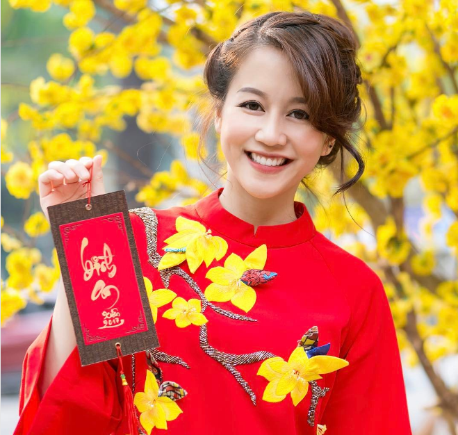 An Nguy rạng rỡ trong tà áo dài đỏ chúc Tết mọi người.