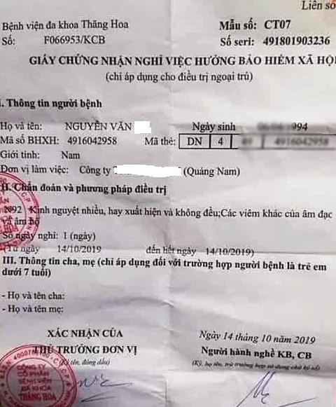 Giấy chứng nhận nghỉ việc hưởng bảo hiểm xã hội của Bệnh viện đa khoa Thăng Hoa chẩn đoán nam thanh niên “kinh nguyệt nhiều, không đều” - Ảnh: Facebook