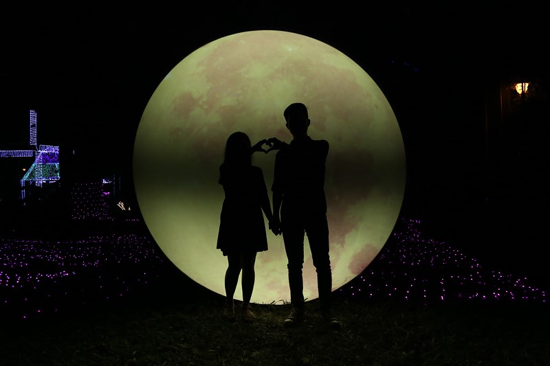 Hai bạn trẻ tạo dáng chụp ảnh với hiệu ứng đèn Led mặt Trăng.