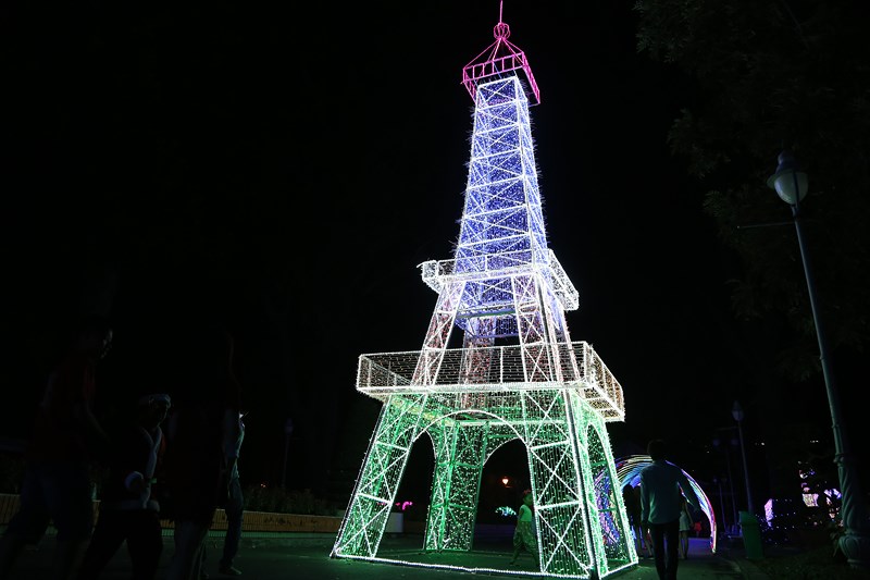 Với quy mô lên đến hàng triệu bóng đèn led được tạo hình các địa danh nổi tiếng thế giới, đèn ba chiều công nghệ cao, các loại đèn tạo hình động vật, 9999 đóa hoa hồng…Trong ảnh: Mô hình tháp Eiffel nước Pháp bằng đèn Led lộng lẫy, nhiều màu sắc.
