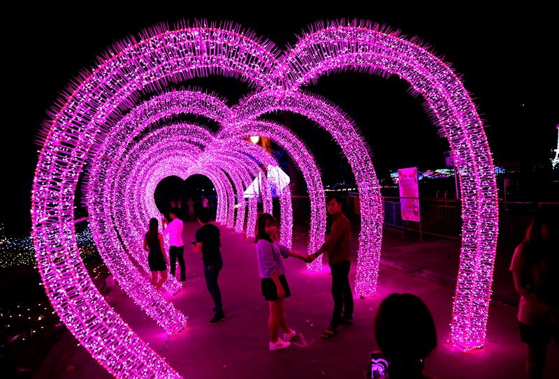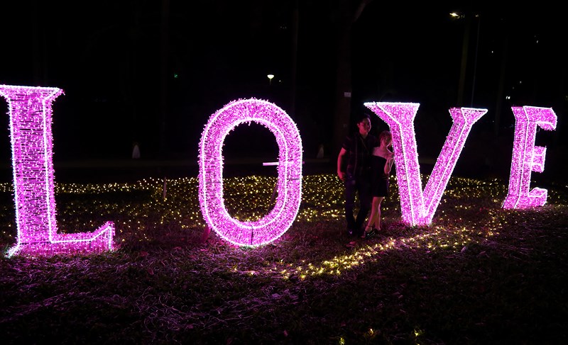Hai bạn trẻ tạo dáng lãng mạn bên cạnh mô hình đèn Led tình yêu.