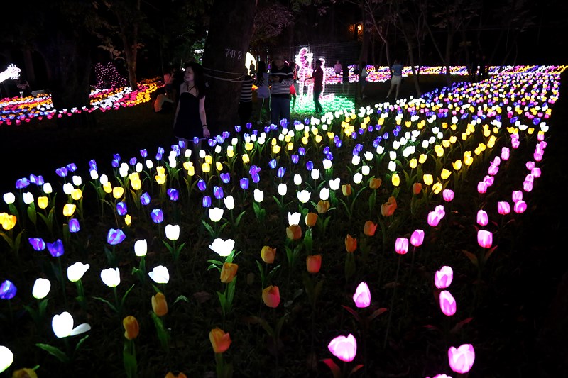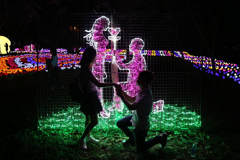 Dọc bờ hồ trong khuôn viên Thảo Cầm Viên là cánh đồng hoa rực sáng bởi hiệu ứng đèn Led.