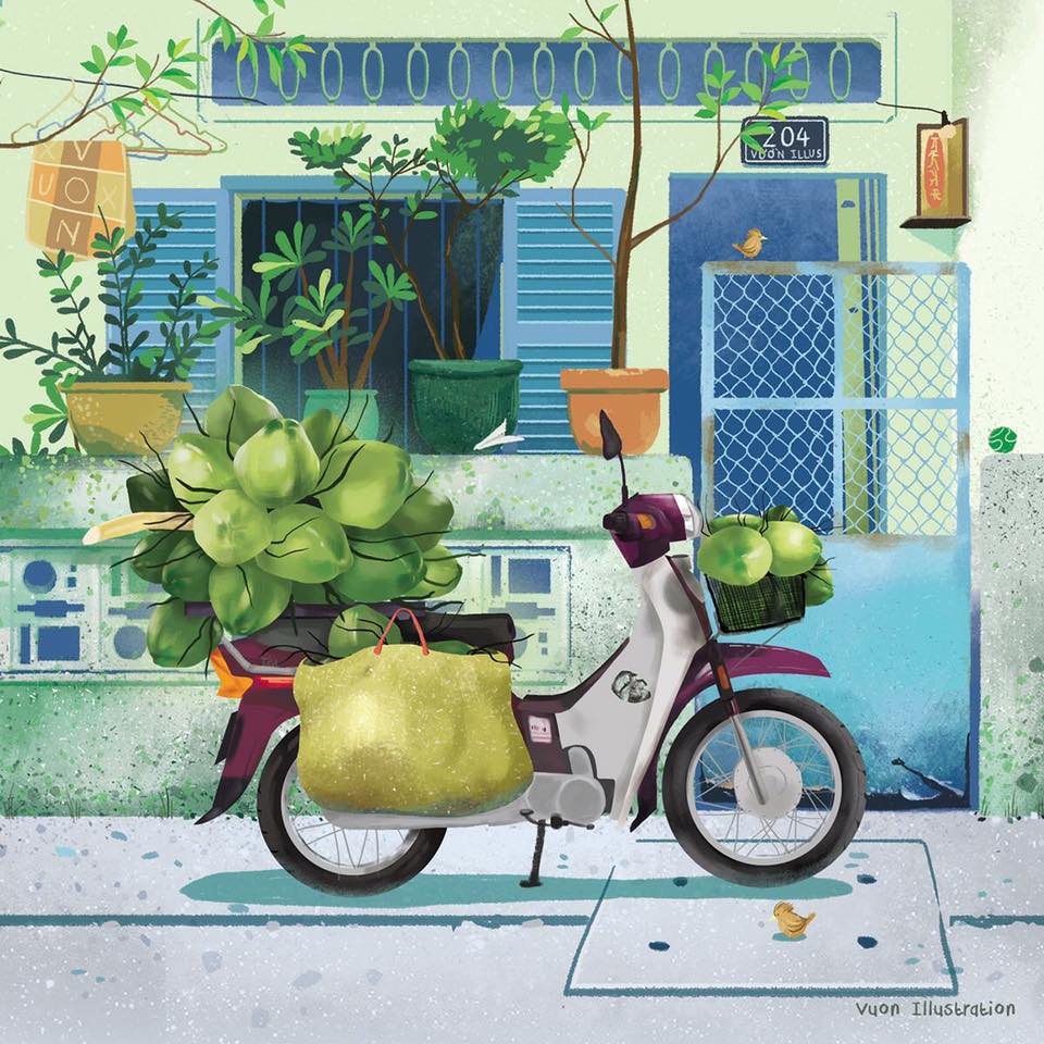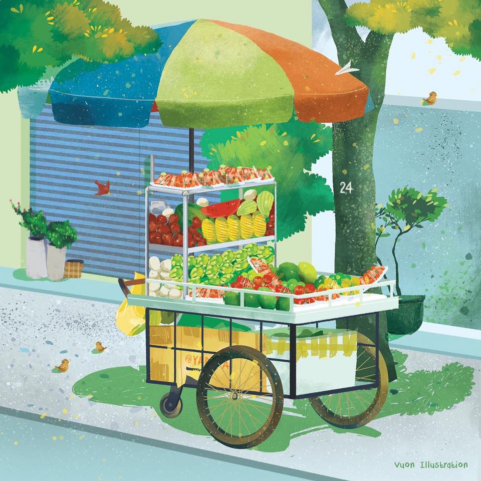 Bạn có chắc mình đã không nuốt nước bọt “ực” một cái mỗi khi xe trái cây hoành tráng này đi ngang qua. Nguồn: Vườn Illustration