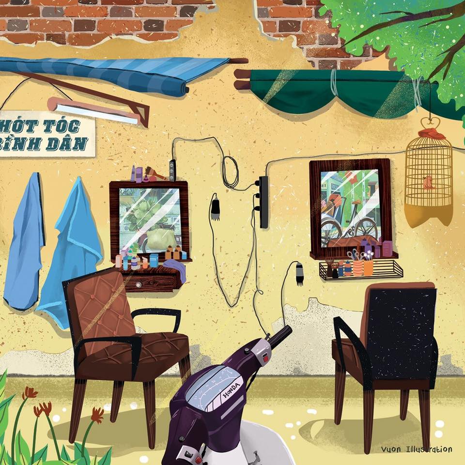 Tấm gương cũ, một hai chiếc ghế cao, vài cái kéo, một chiếc tông đơ đủ làm nên cả một sự nghiệp. Với những chàng trai thành thị chuộng sự đơn giản, họ chẳng cần kiểu cọ hay chải chuốt thì tiệm hớt tóc lề đường là sự lựa chọn chung thuỷ từ thanh xuân đến cả khi bạc đầu. Nguồn: Vườn Illustration