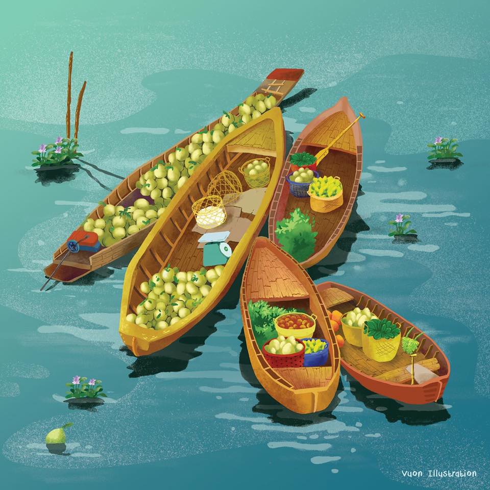 Chợ nổi với từng đoàn ghe nối tiếp nhau, mang trên mình nào là bưởi ngon Bến Tre, xoài thơm, rau tươi sạch đến với những bà nội trợ miền quê, họ đang ngóng chờ mua cho bằng được vài thứ thơm ngon nhất để có thể chuẩn bị một mâm cỗ thật chu đáo cho ngày cuối năm. Nguồn: Vườn Illustration