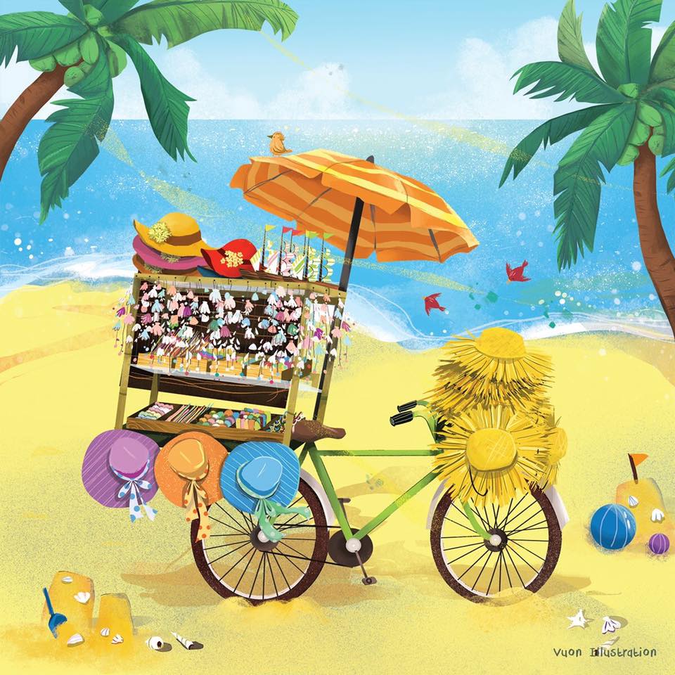 Chia tay phố thị, tạm biệt sông nước để về với những bờ biển xanh, cắt vàng tuyệt đẹp. Bạn có nhớ ngày còn thơ ấu, mình đã từng khao khát biết bao nhiêu khi muốn sở hữu một món hàng gì đó từ chiếc xe này không? Nguồn: Vườn Illustration