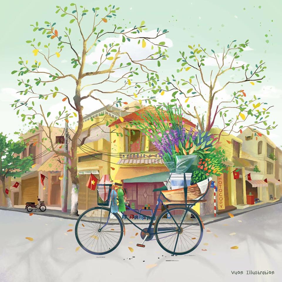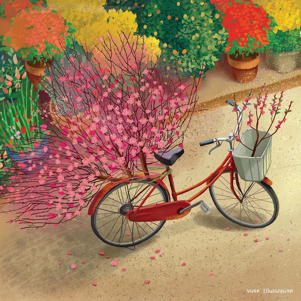 Hễ cứ Tết đến Xuân về, phố phường Hà Nội lại ngập tràn sắc màu cuả những chợ hoa xuất hiện dọc phố, màu sắc chủ đạo nhất vẫn phải kể đến ánh hồng của những cành đào đang chuẩn bị trổ hoa. Bạn có nhớ chiếc xe đạp Phượng Hoàng ngày xưa của bà, của mẹ, cứ đến lúc chở theo một cành đào xinh về nhà là Tết đã đến trong từng hơi thở rồi không? Nguồn: Vườn Illustration