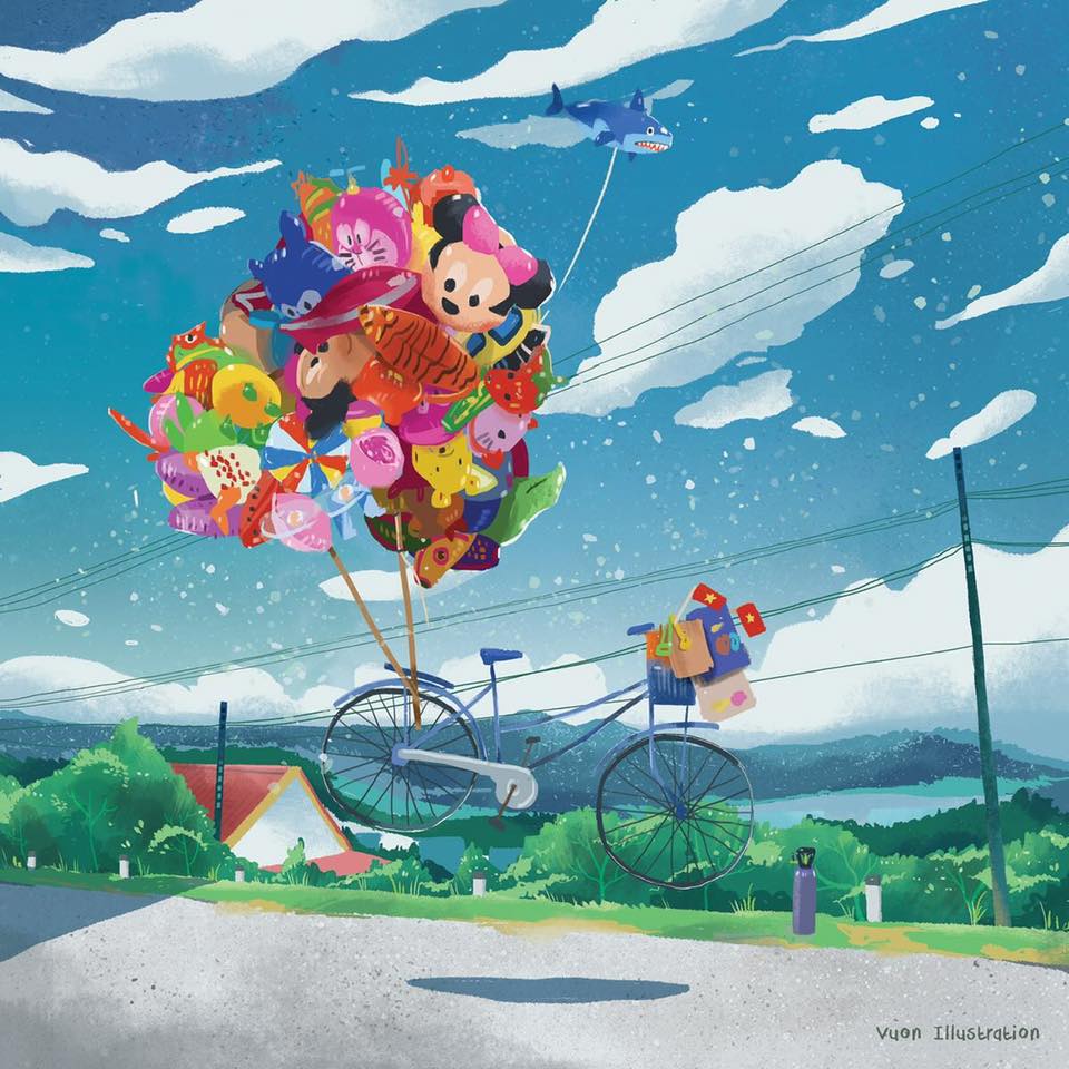 Một trời mơ ước của những đứa trẻ là đây, loại bong bóng mà ngày xưa chỉ những nhà có điều kiện mới dám mua cho con. Nguồn: Vườn Illustration