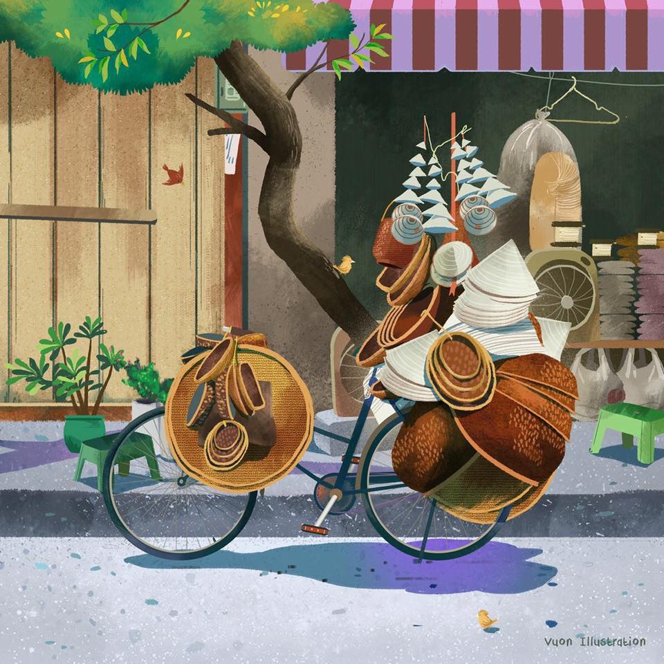 Những chiếc nón lá xinh xinh, cái thúng mây, chiếc nia tre mang đầy mùi hương làng quê mà mỗi sớm người bán vẫn đạp xe chở theo, rong ruổi khắp các ngõ hẻm nhỏ. Nhìn đơn sơ là thế nhưng nó cũng như những thành viên trong một gia đình nhỏ, có thể đi xa, có thể thi thoảng mới gặp nhưng không thể thiếu được những hình ảnh về nó trong tâm trí mỗi người dân thành thị. Nguồn: Vườn Illustration
